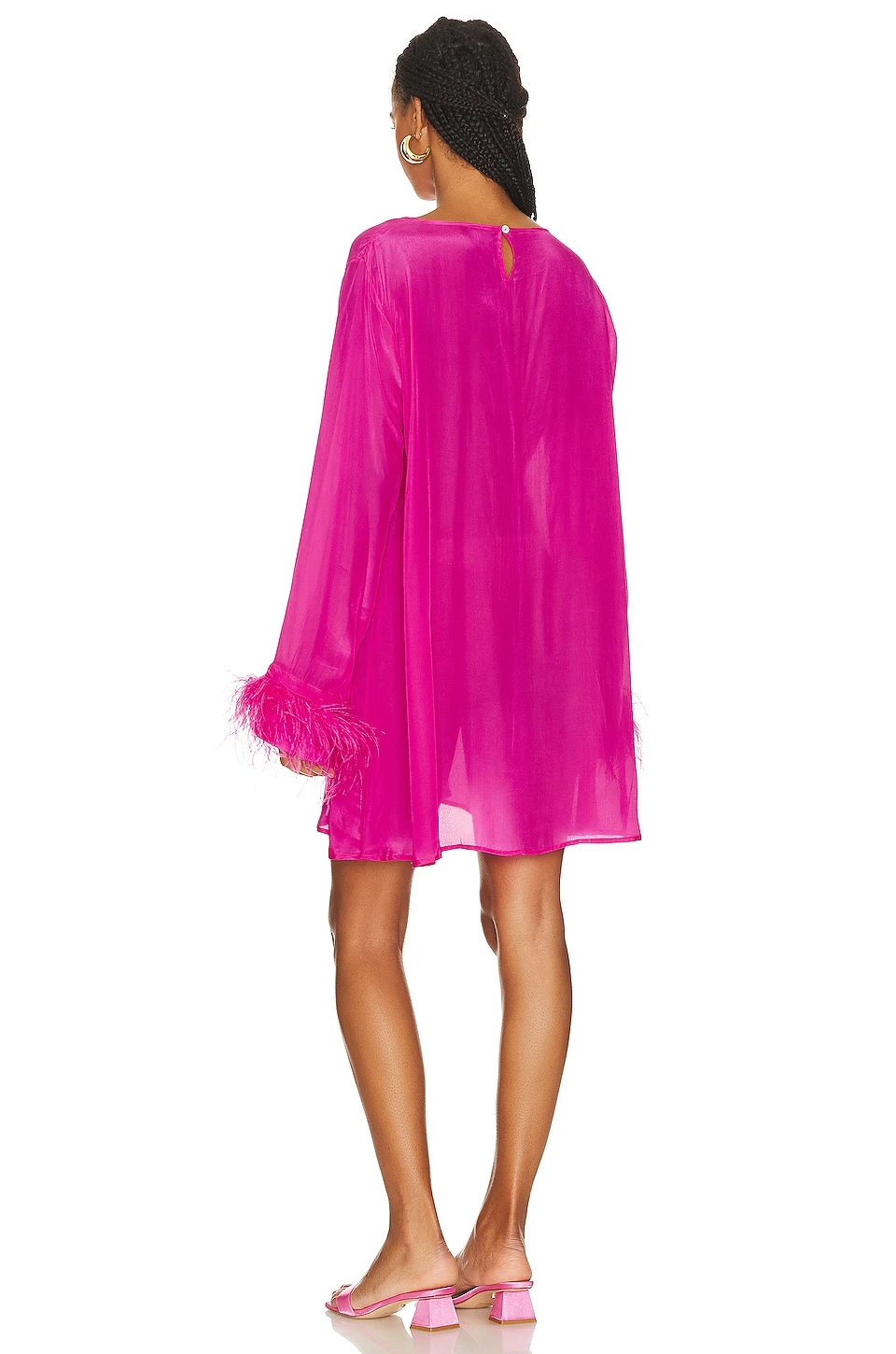 - Kimono style sleeves with feather cuffs